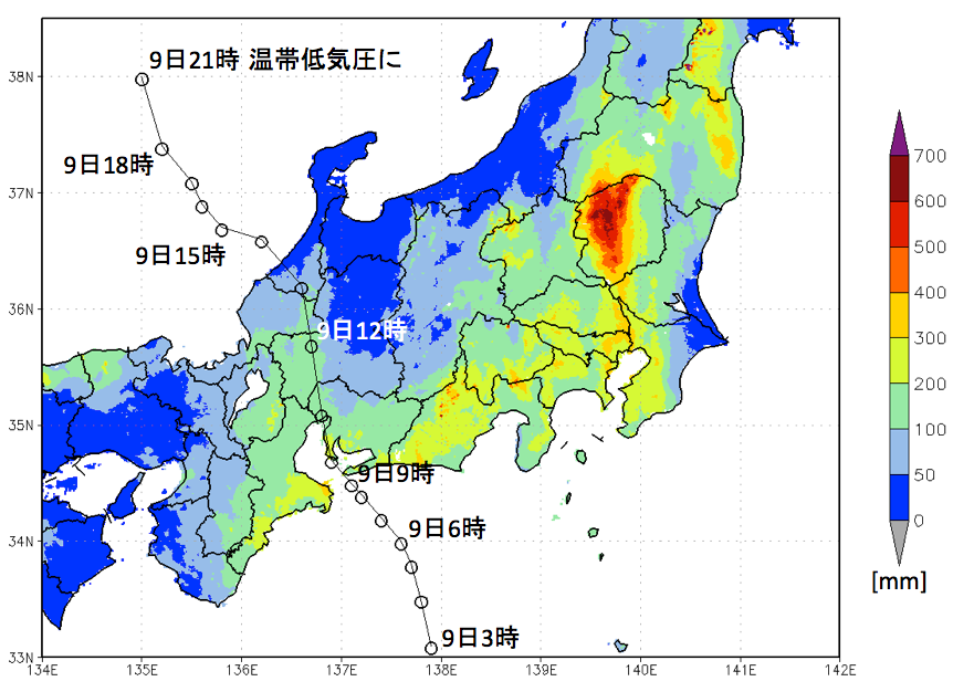 Many observational stations in Tochigi showed record rainfall on September 9th. Table 1 shows record rainfall observations, and Imaichi in Tochigi recorded a total accumulation of 668mm. Rain continued to fall in Tochigi for several days. In addition, heavy rains were also recorded at Koshigaya (Saitama), Ote-machi (Tokyo), Sagamiko (Kanagawa), as well as Toba (Mie) close to the storm, and Hamamatsu (Shizuoka) which was affected by a frontal zone a day before the storm arrived.