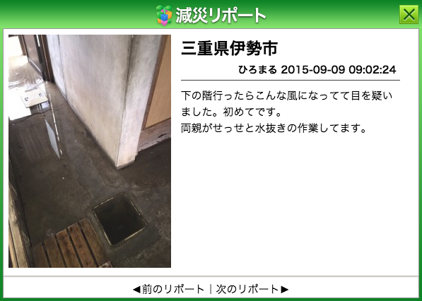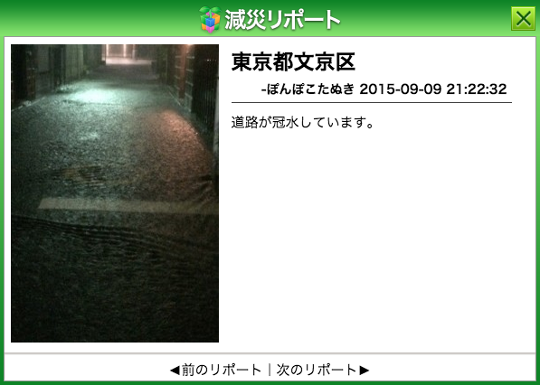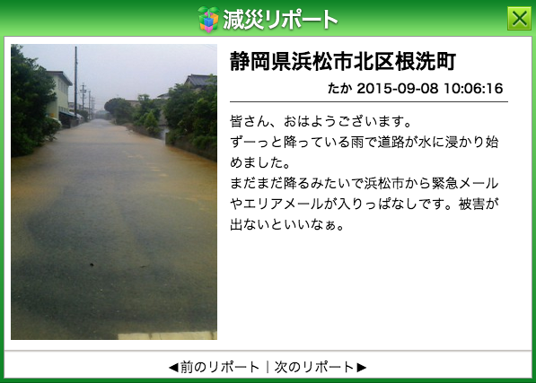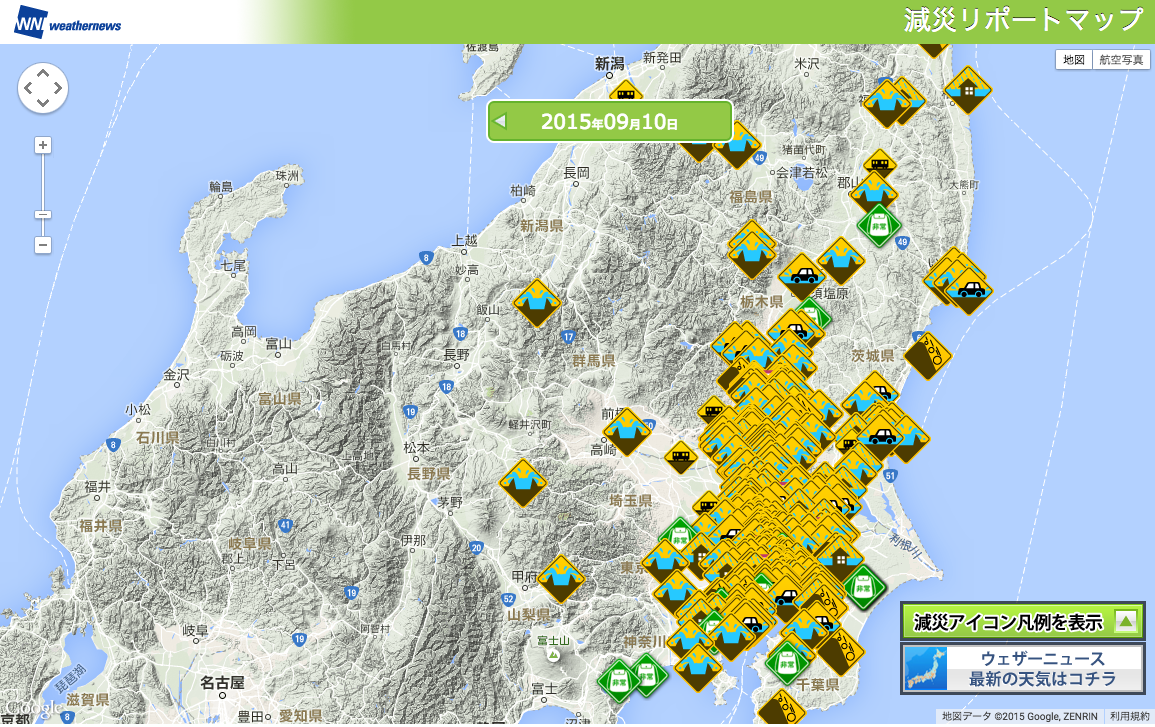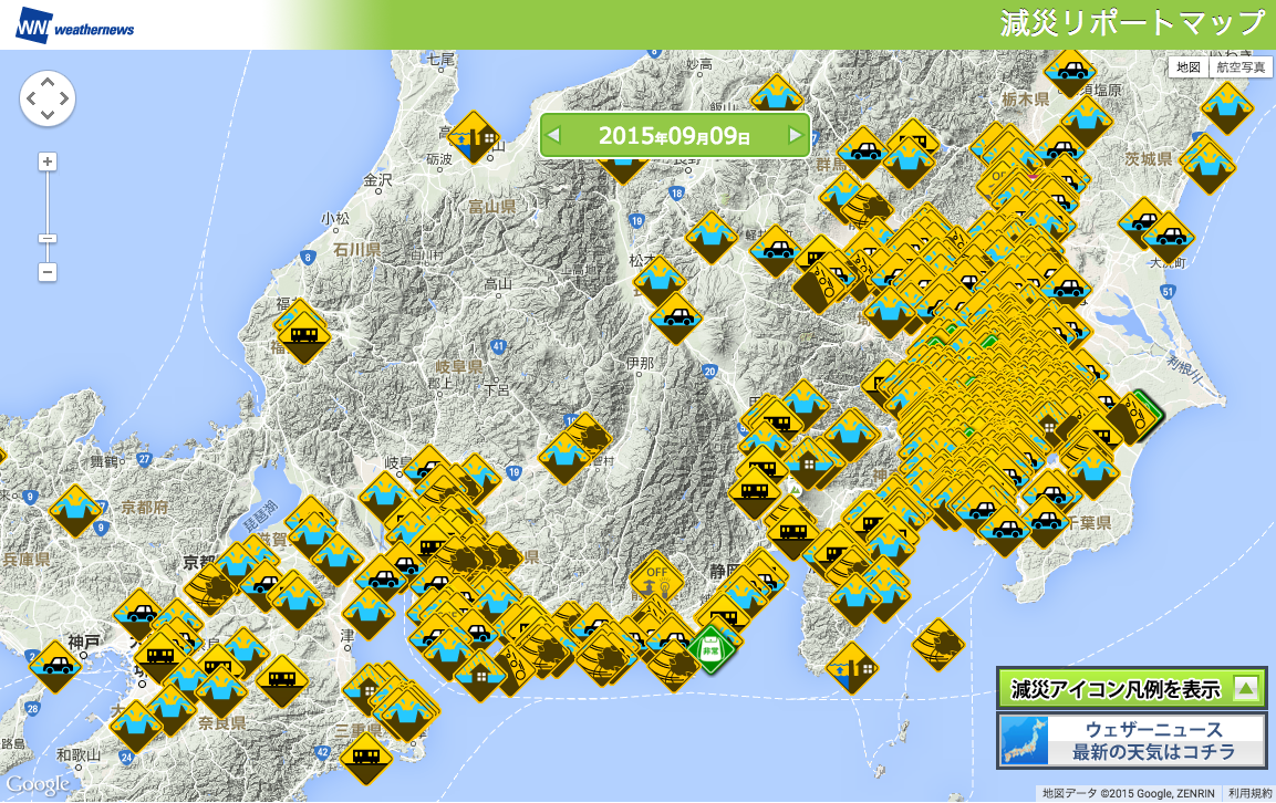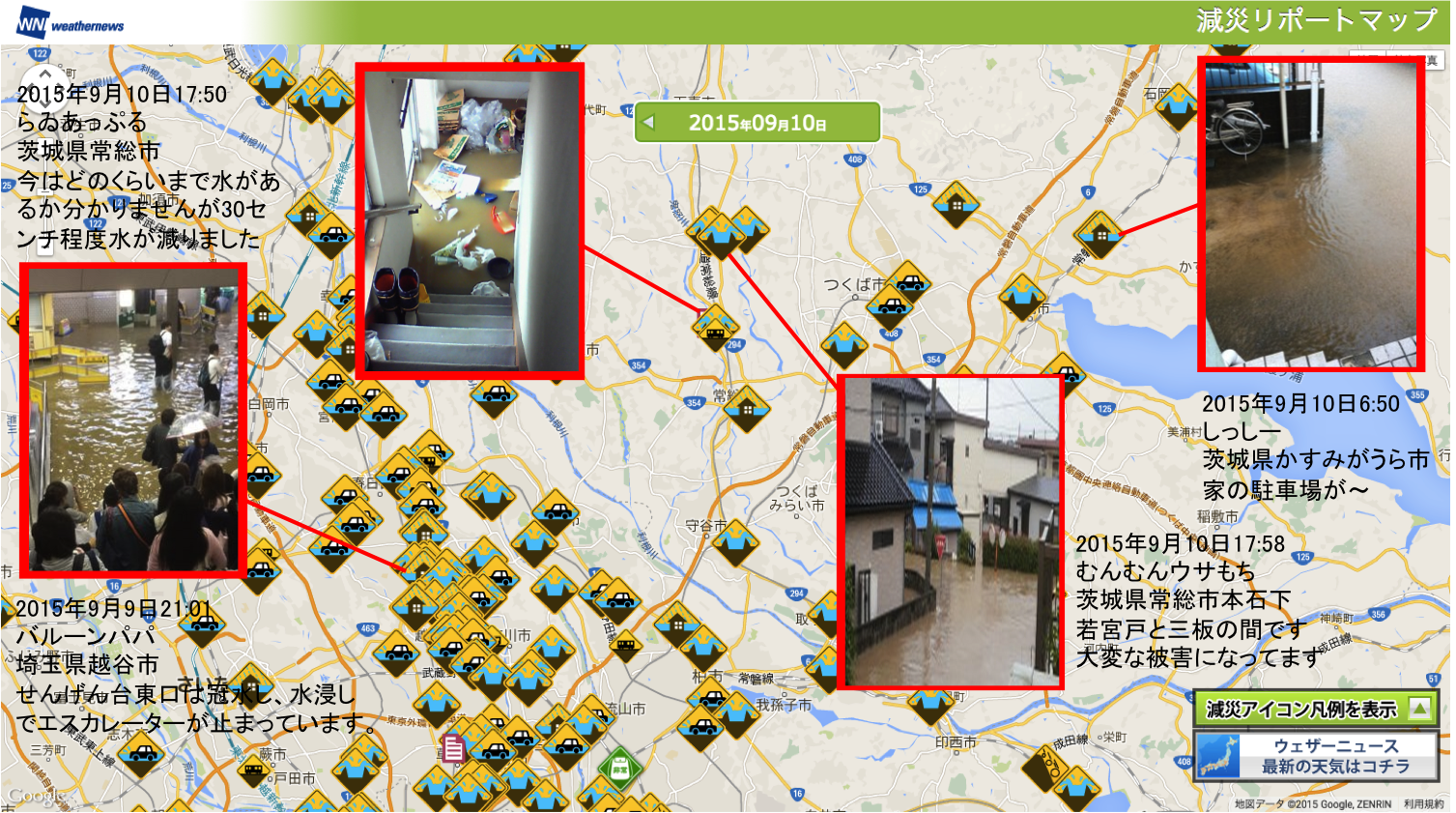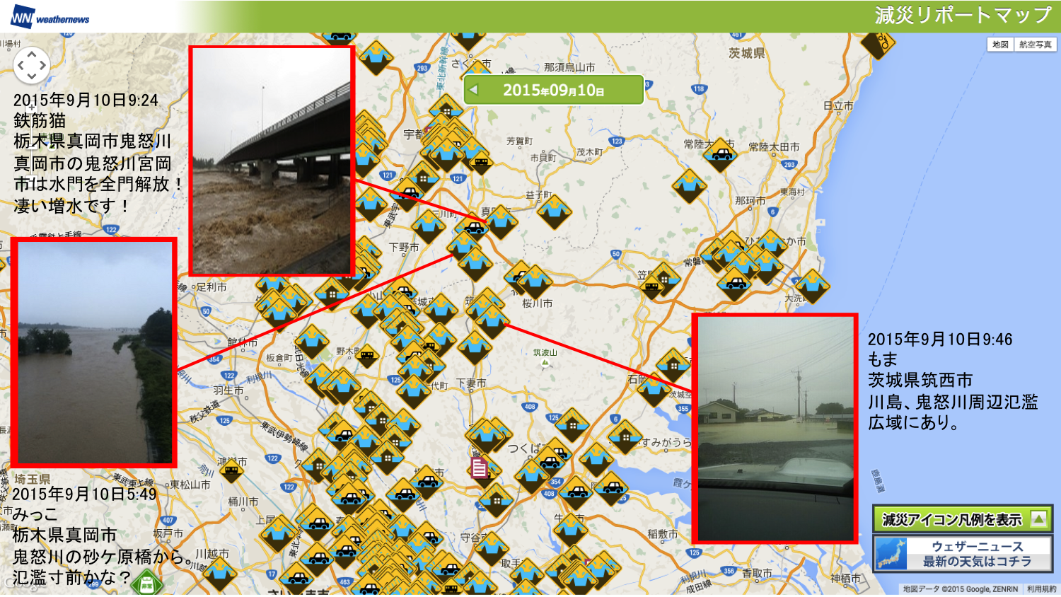 Weathernews received a total 70,200 reports regarding sky and rain conditions from before the approach of Tropical Storm Etau. This includes 720 damage reports received from September 8-10. Many of these included road inundation and other reports from Kii Peninsula and Tokai to Kanto on September 8-9 (Figure 2). On September 9-10 many river flood reports were received mainly from Kanto. Widespread flood reports from Tochigi were received from the field especially on September 9-10. The breakwater at Joso in Ibaraki, near downstream Kinugawa River, was breached leading to major flooding.