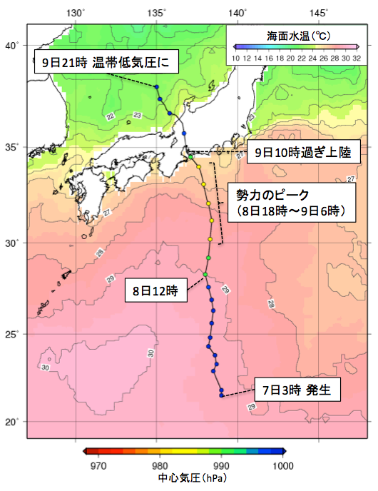 Tropical Storm Etau formed on September 7th at 0300JST in the western Pacific south of Japan near 21.5N/139.0E and tracked northward along the periphery of a high pressure system to the east of the storm (Figure 3). On September 8th the storm tracked across a warm Sea Surface Temperature (SST) area of 28~29℃. The water vapor gained from this area of warm waters fuel deepening of the storm. The storm peaked at 985hPa with winds near the center of 25m/s south of the Tokai region of Japan. The storm then moved NNW then NW-ward, making landfall just after September 9th at 1000JST over the Chita Peninsula of Aichi Prefecture. The storm then tracked over Gifu, Fukui and Ishikawa before moving over the Sea of Japan by September 9th 2100JST and becoming an extratropical cyclone. Tropical Storm Etau became the fourth storm of 2015 to make landfall in Japan. This was the first time in 11 years (2004) that there were four land-falling tropical cyclones in Japan.