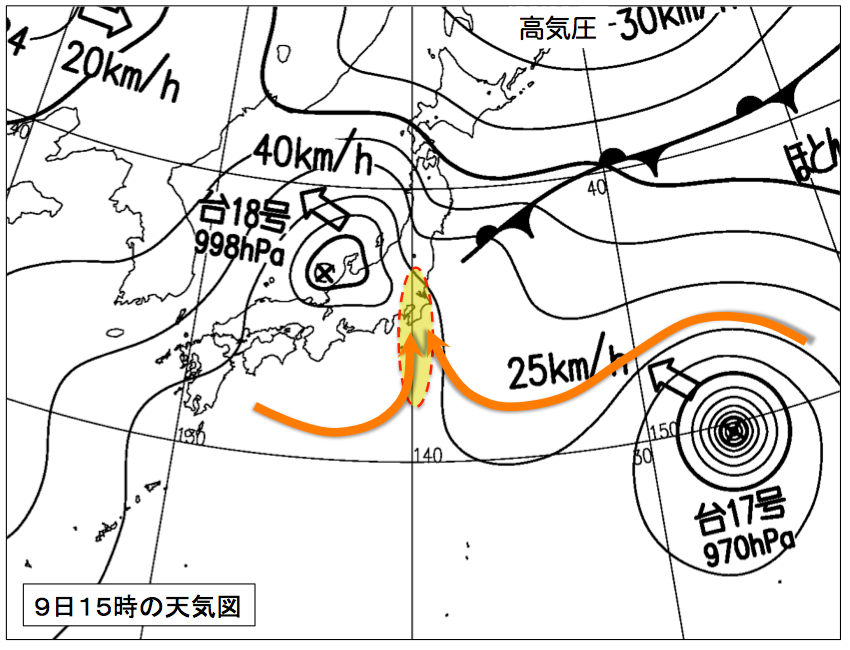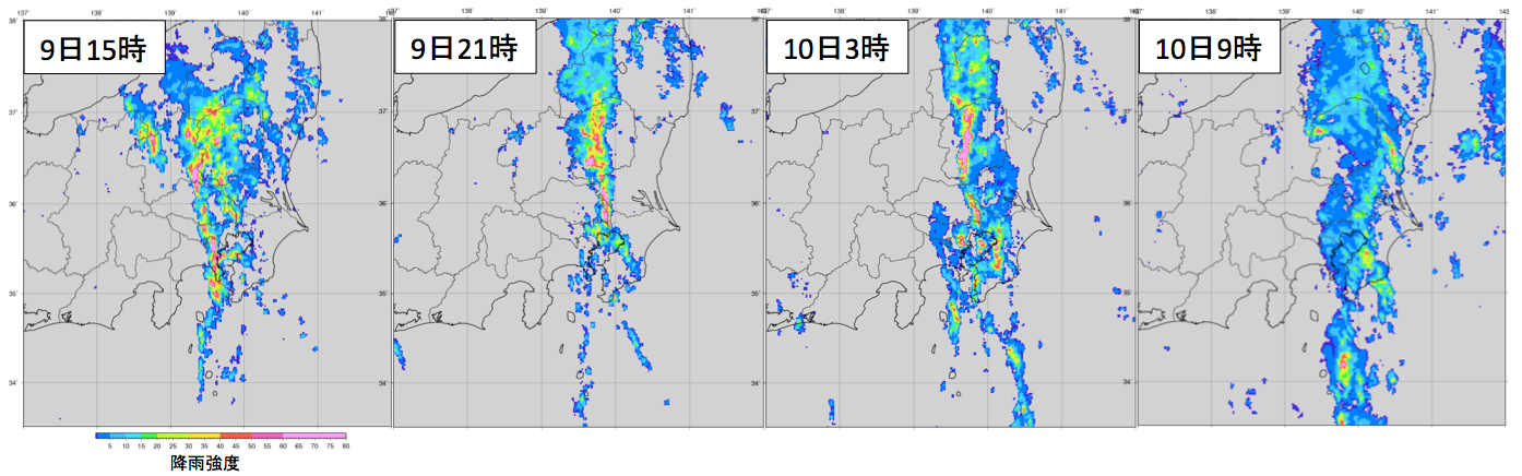 A line of cumulonimbus clouds formed over the Kanto region and remained stationary from around September 9th 1500JST to around the 10th at 1200JST, bringing a long period of heavy rains over the same area. The reason for this was the convergence of warm moist southerly winds being pulled into the quasi-stationary extratropical remnants of Etau in the Sea of Japan with easterly winds from Typhoon Kilo far to the east of the region.