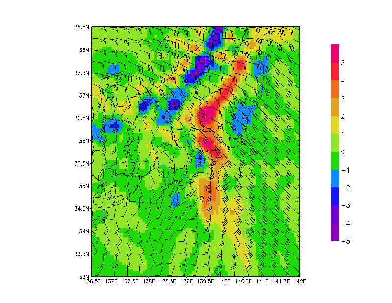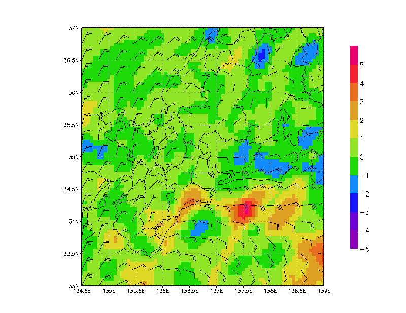 Figure 12: Sep. 8th 0900JST500m (925hPa) winds and water vapor convergence (g/[kg*s]) analysis. |