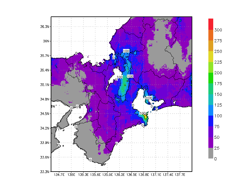 Daily accumulated rainfall as analyzed by Weathernews shows localized areas of over 200mm of rain on September 9th over the northern part of Shima Peninsula (Figure 7). The observation station at Toba recorded 247mm in a day, the fourth largest on record, and a maximum hourly precipitation rate of 75.5mm which is a record for the station. An intense rain band near the center of the storm passed Toba on September 9th between 0600-1700JST. The radar echoes from September 9th 0500-1000JST (Figure 8) show that this was the strongest timing of rain in the area.