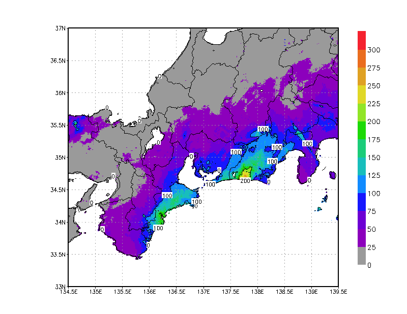 The daily cumulative rainfall analysis by Weathernews shows that on September 8th, a day before the landfall of Tropical Storm Etau, western Shizuoka and southern Mie received over 150mm of rain on the coast and that Hamamatsu received over 200mm (Figure 9). The observation station in Hamamatsu recorded 238.5mm in 24 hours (Sep 7/2100JST to Sep 8/2100JST) which is a record for September.